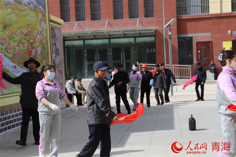 護(hù)工正與老人們一起在小廣場上跳舞。人民網(wǎng) 馬可欣攝