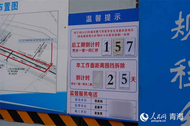 施工現場的倒計時牌以及監(jiān)督服務電話。人民網 馬可欣攝