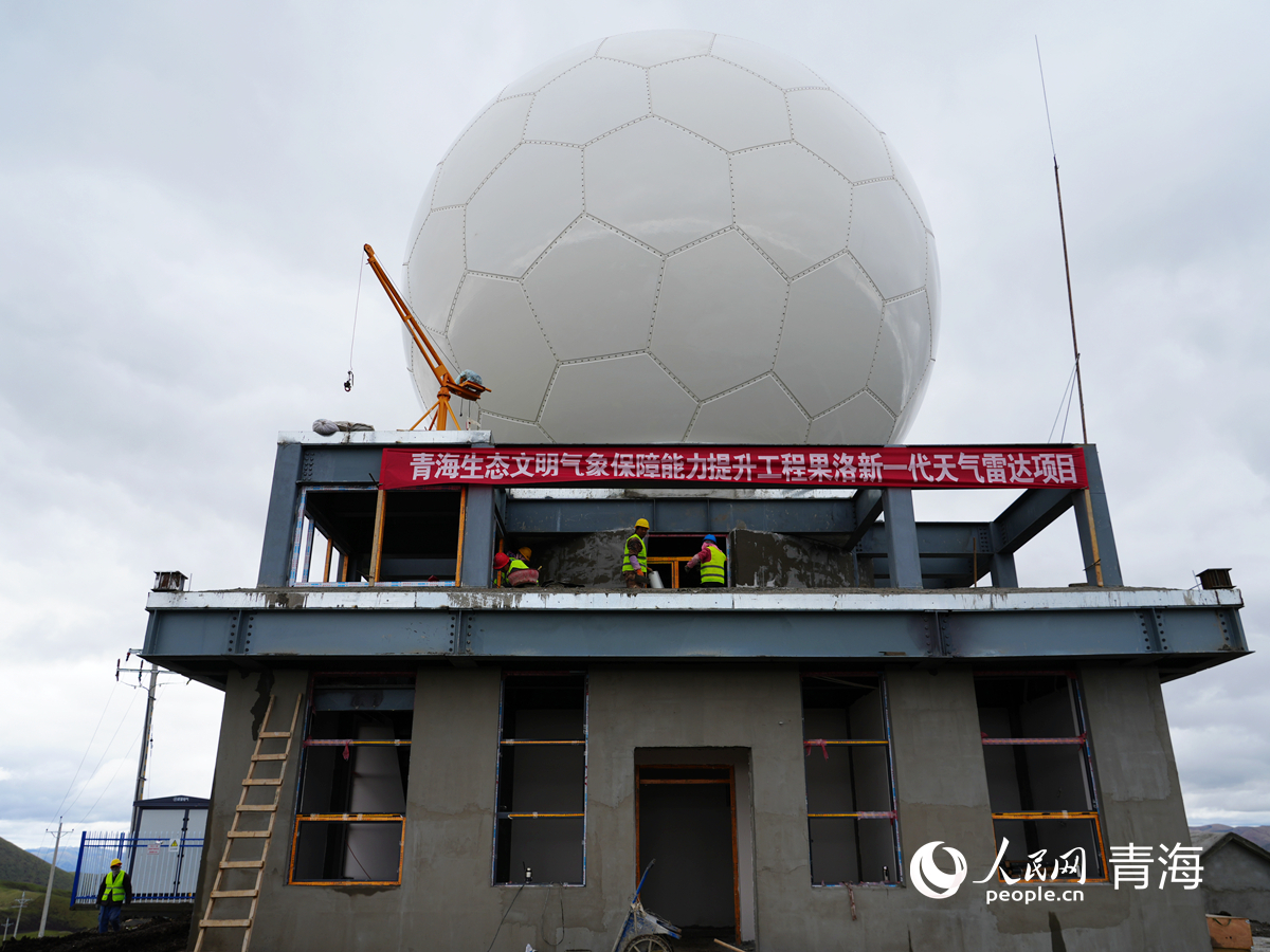 果洛新一代天氣雷達項目施工現(xiàn)場,工人正抓緊時間施工。人民網(wǎng)記者 楊啟紅攝