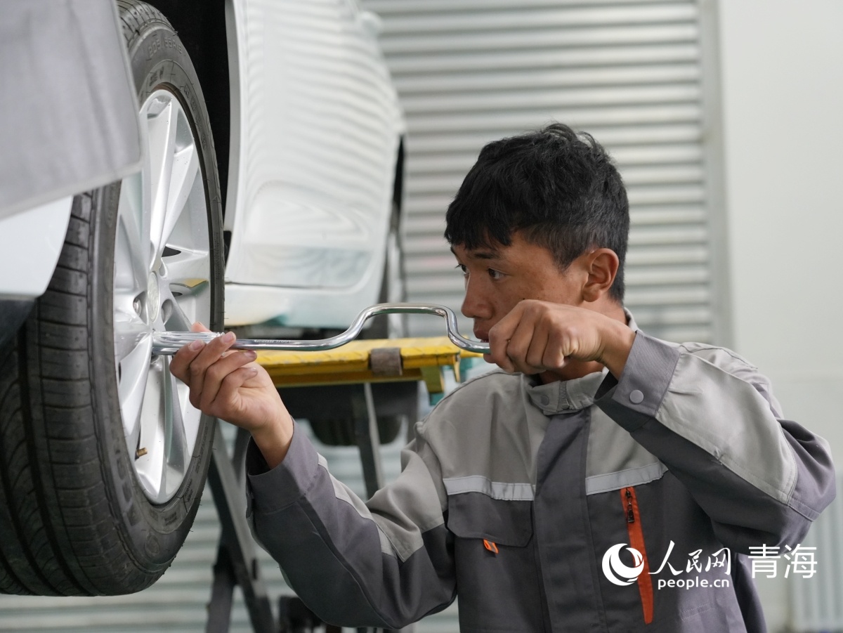 果洛州職業(yè)技術(shù)學(xué)校汽車運用與維修專業(yè)學(xué)生實操。人民網(wǎng)記者 楊啟紅攝