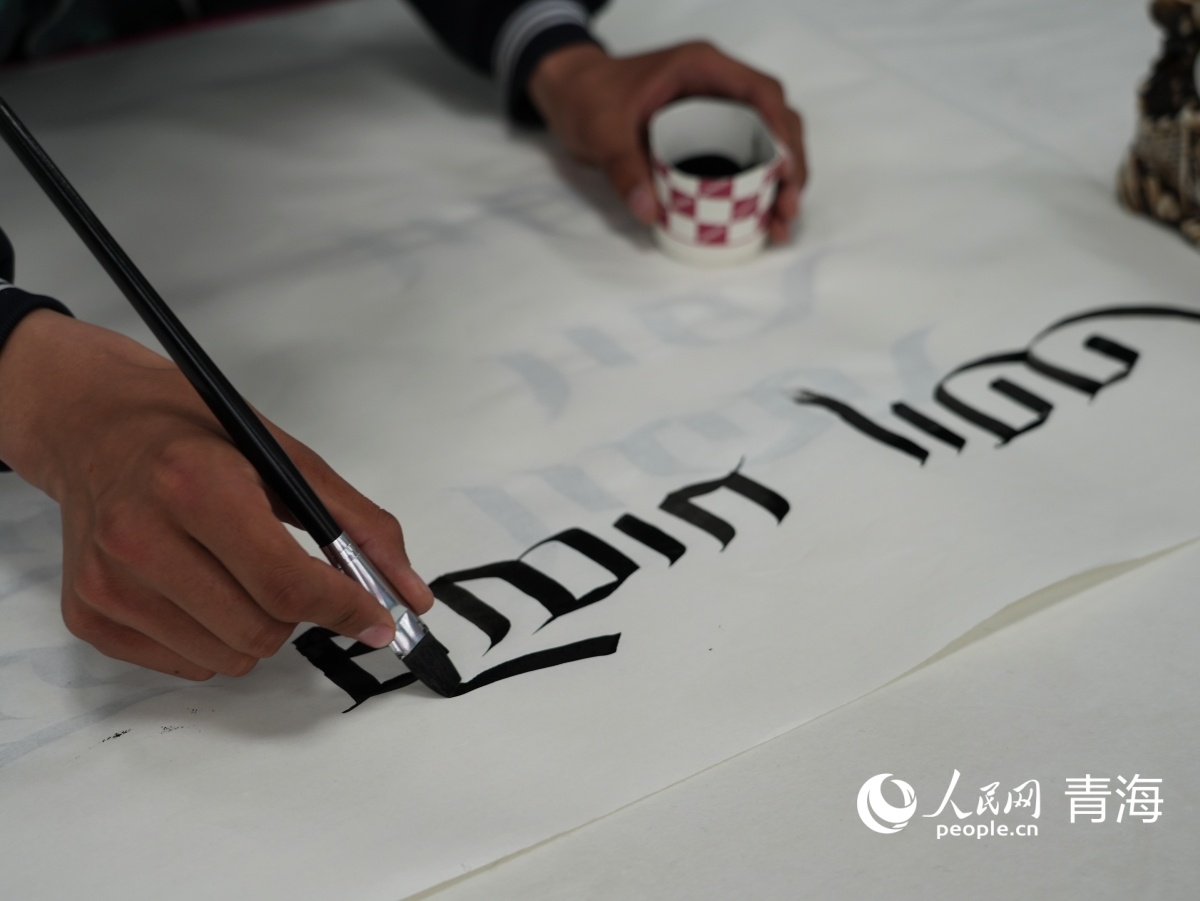 高星級飯店運營與管理專業(yè)學(xué)生展示德昂灑智書法技藝。人民網(wǎng)記者 楊啟紅攝