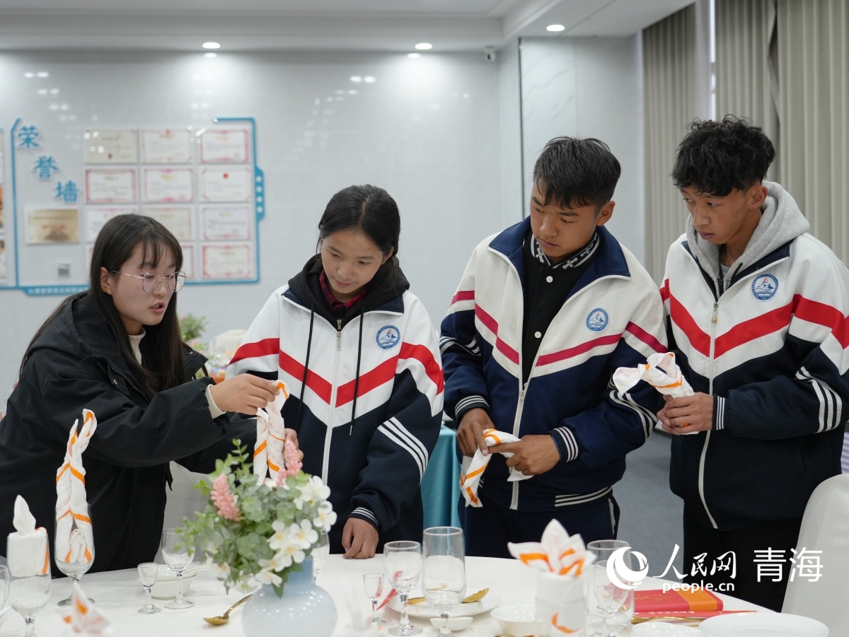 高星級飯店運營與管理專業(yè)學(xué)生學(xué)習(xí)餐飲擺臺。人民網(wǎng)記者 楊啟紅攝