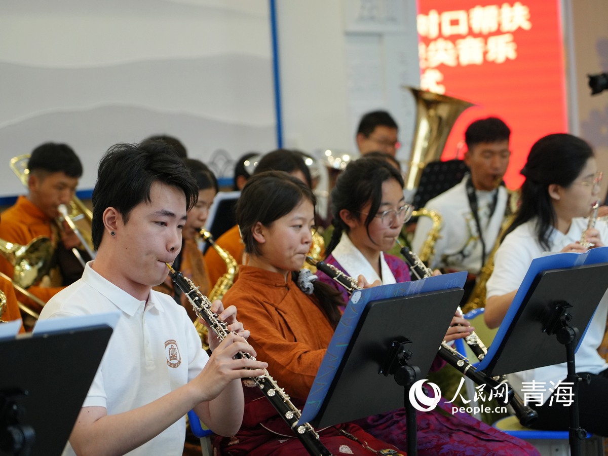 果洛州青少年管樂(lè)團(tuán)、上海音樂(lè)學(xué)院學(xué)生管樂(lè)團(tuán)合奏。人民網(wǎng)記者 楊啟紅攝