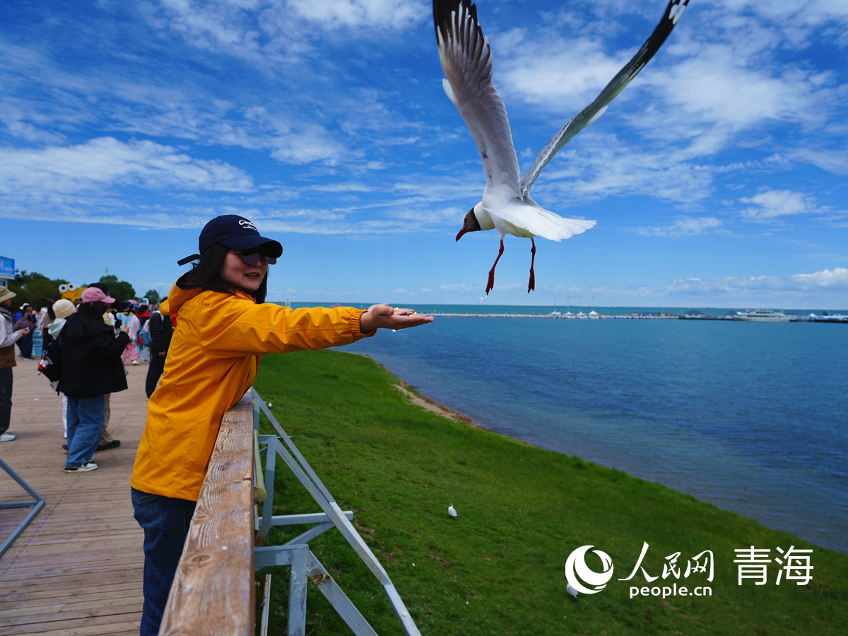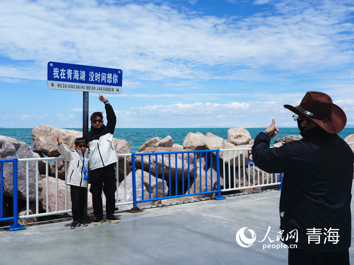 游客在青海湖景區(qū)拍照留念。人民網(wǎng)記者 楊啟紅攝