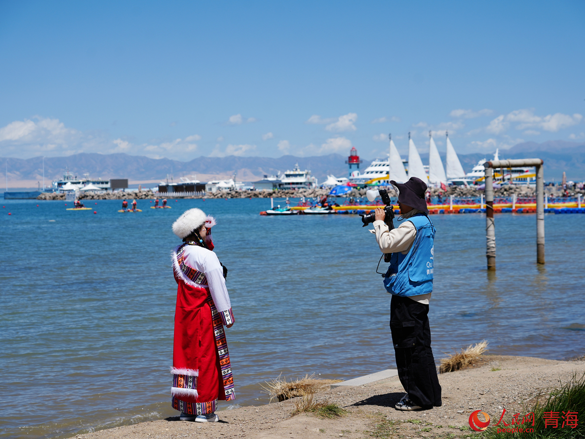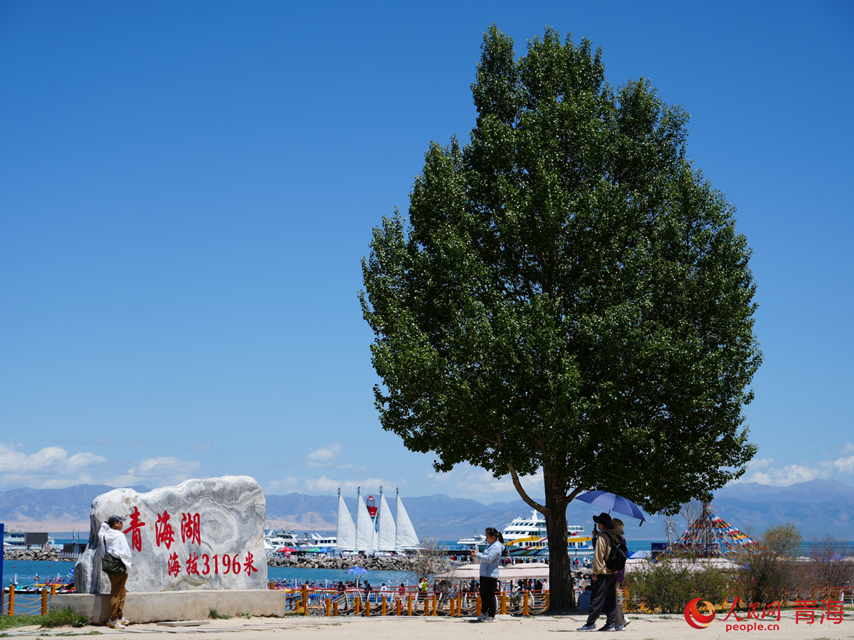 游客在青海湖畔拍照打卡。人民網(wǎng) 顧斐菲攝