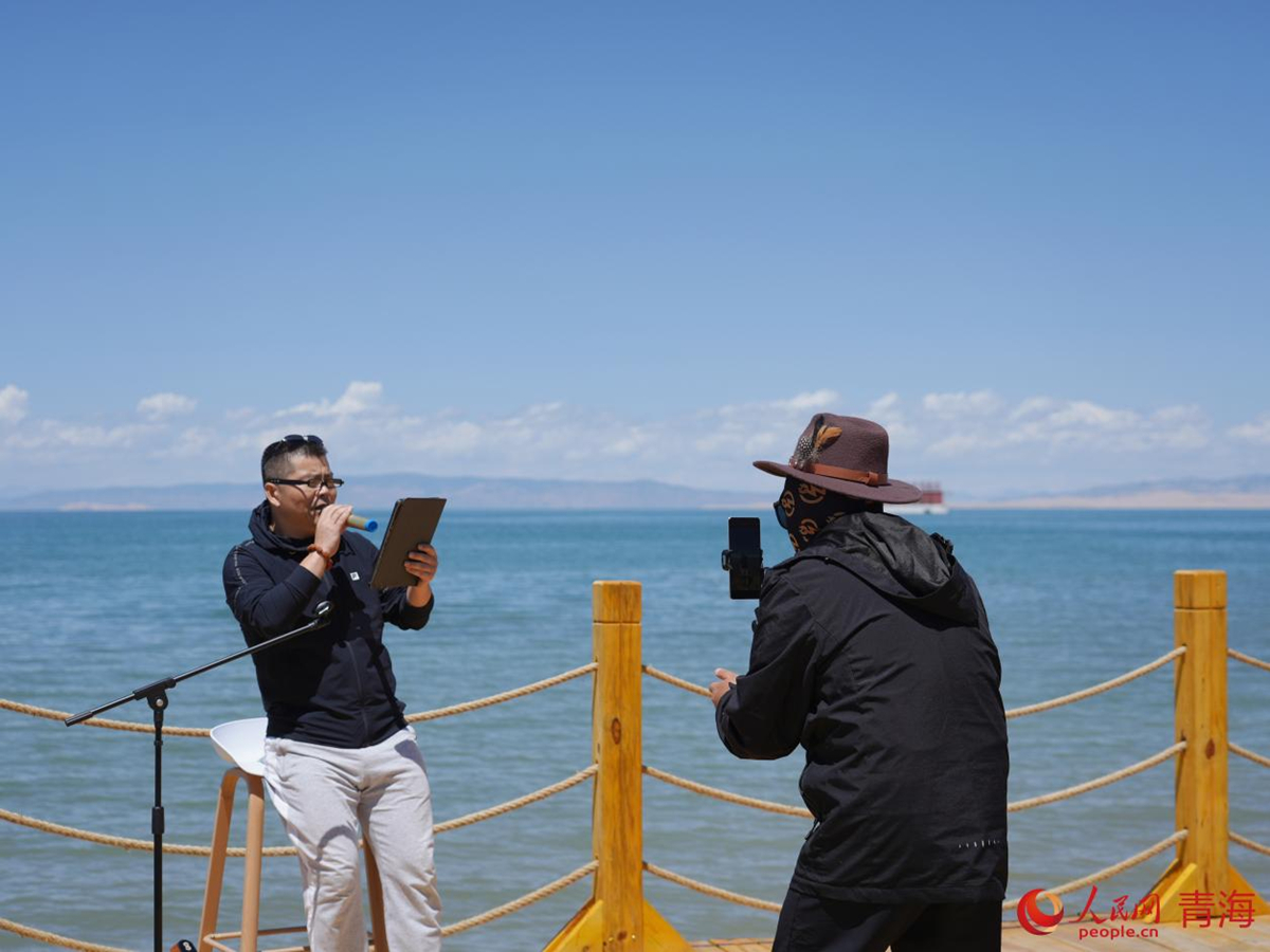 游客在青海湖畔直播唱歌。人民網(wǎng) 顧斐菲攝