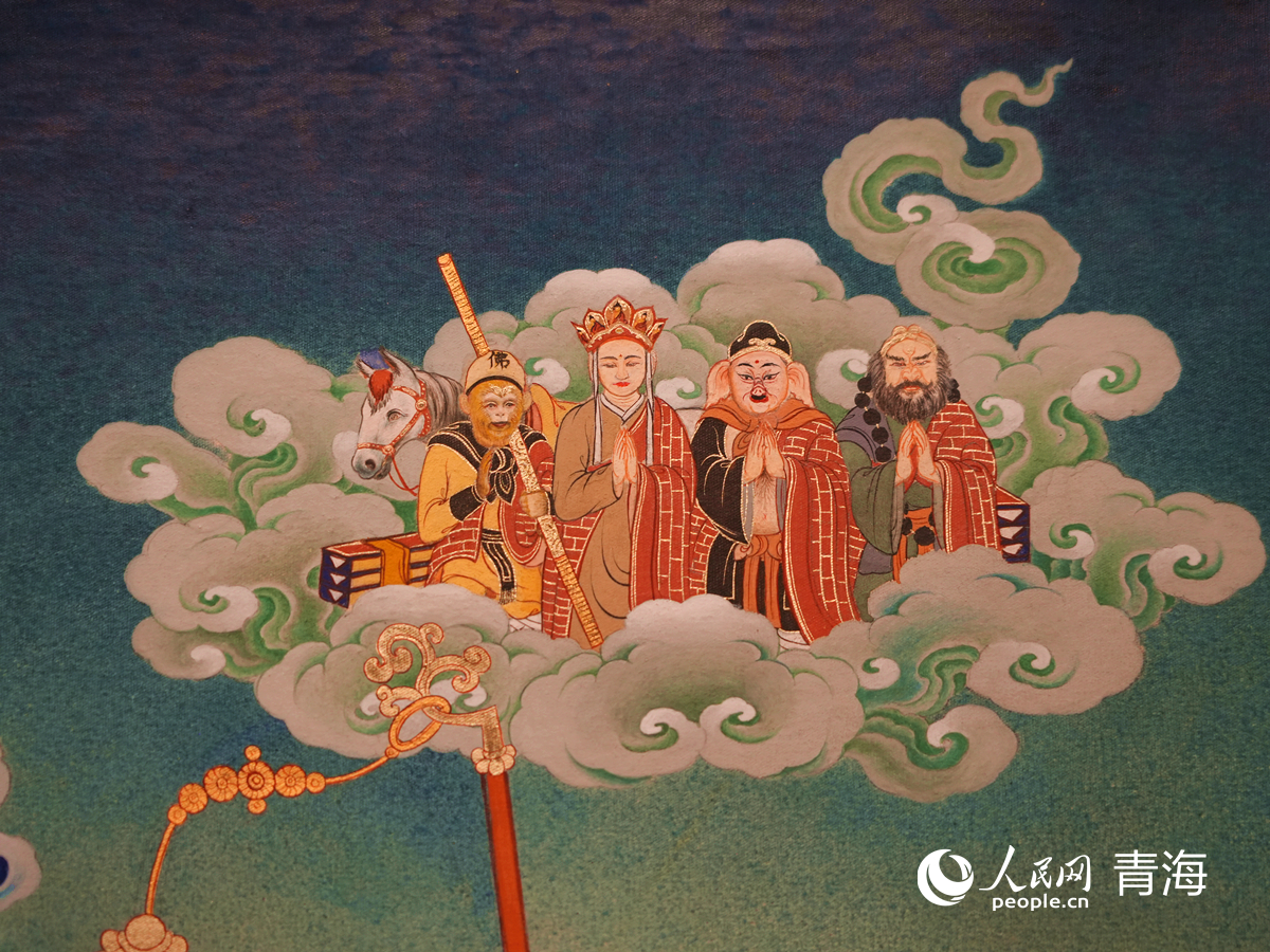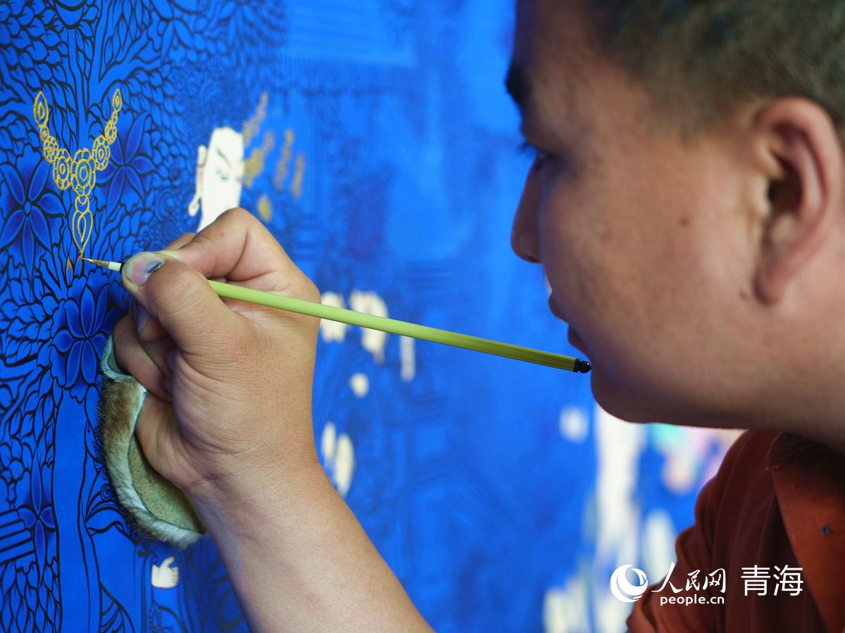 仁俊畫院畫師正在創(chuàng)作援青主題唐卡作品。人民網(wǎng)記者 楊啟紅攝