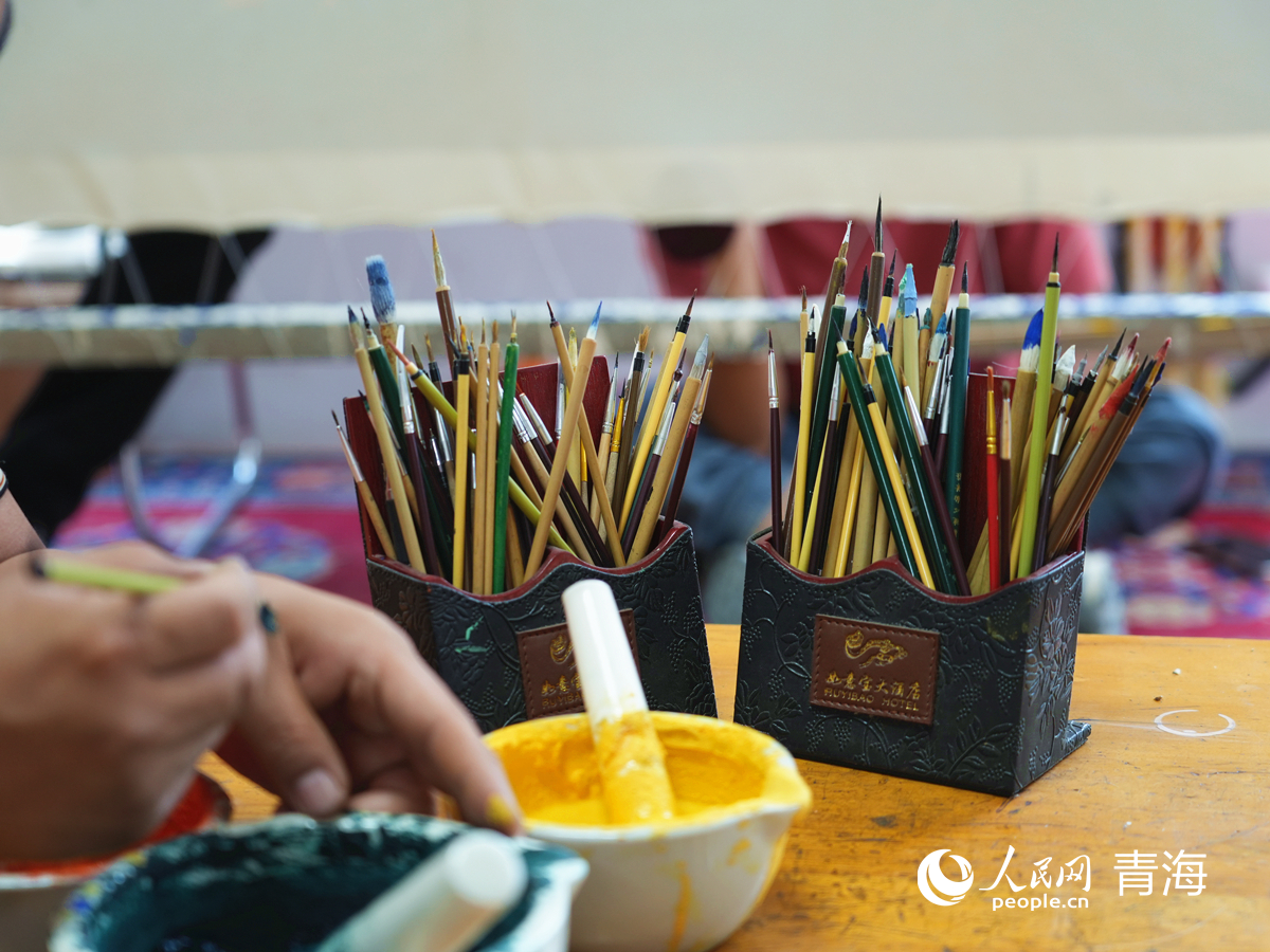 繪制唐卡,需要多種筆和顏料。人民網(wǎng)記者 楊啟紅攝