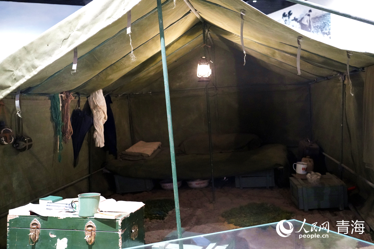 這一頂帳篷是根據(jù)李覺(jué)將軍曾經(jīng)居住過(guò)的帳篷場(chǎng)景復(fù)原的,1958年,李覺(jué)將軍帶領(lǐng)著20多人的隊(duì)伍,帶著3頂帳篷等物資先期進(jìn)入金銀灘草原,著手準(zhǔn)備基地建設(shè),李覺(jué)將軍曾回憶:這里氣壓低,氧氣少,水燒不到沸點(diǎn),飯煮不到全熟,一年有八九個(gè)月都在穿棉襖,有些人還會(huì)高原缺氧、高原水腫,但大家依然堅(jiān)持工作。