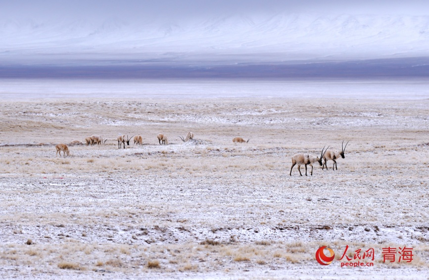 藏羚羊在雪原上覓食。人民網(wǎng)記者 甘海瓊攝