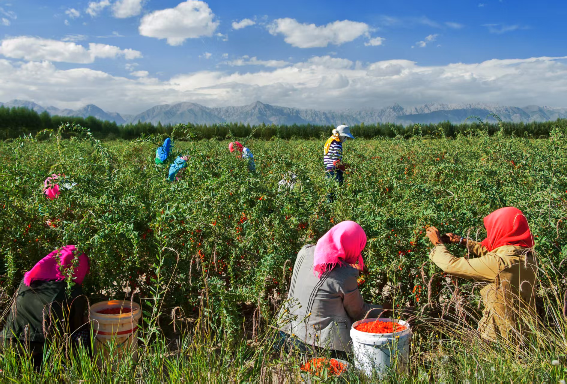 “格爾木干旱,降水少,適合枸杞成長,枸杞出果時不能經(jīng)常下雨,一下就壞。更主要的是這里日照強,種出來的枸杞甜?!狈N植枸杞15年的承包戶海永存一邊指導(dǎo)工人采摘,一邊講著枸杞的生長背景。