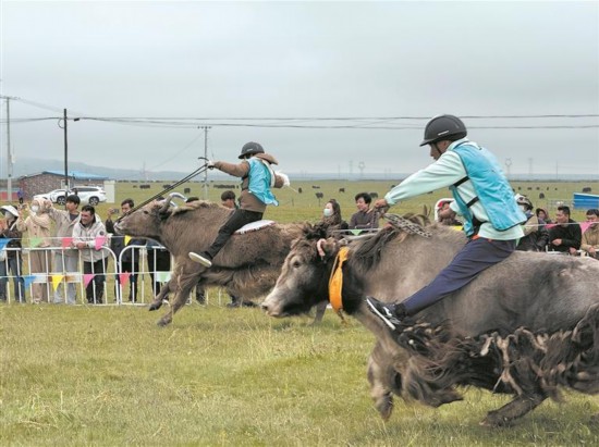 賽牦牛項(xiàng)目現(xiàn)場,“高原之舟”威風(fēng)凜凜向前沖刺。青海日?qǐng)?bào)記者 劉程錦 攝