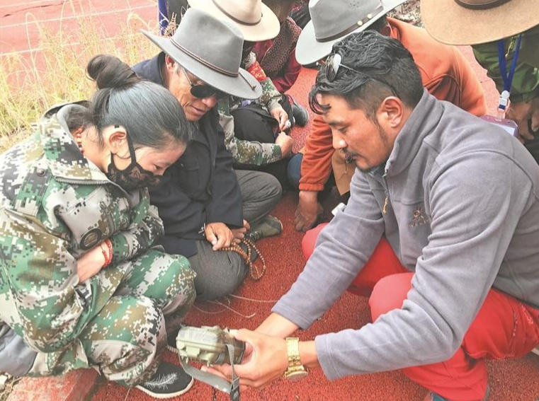 生態(tài)管護(hù)員學(xué)習(xí)紅外相機(jī)使用。雜多縣委宣傳部供圖