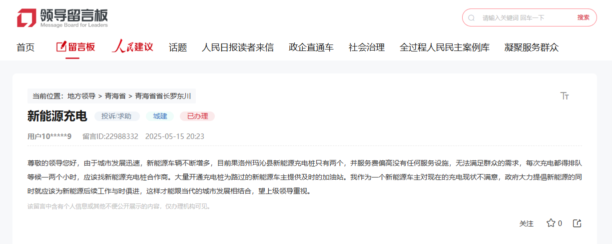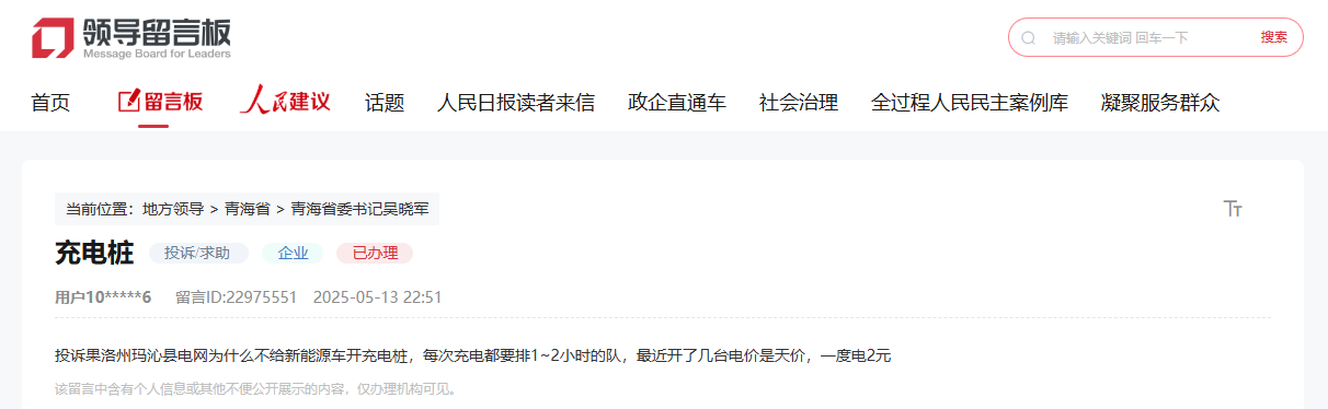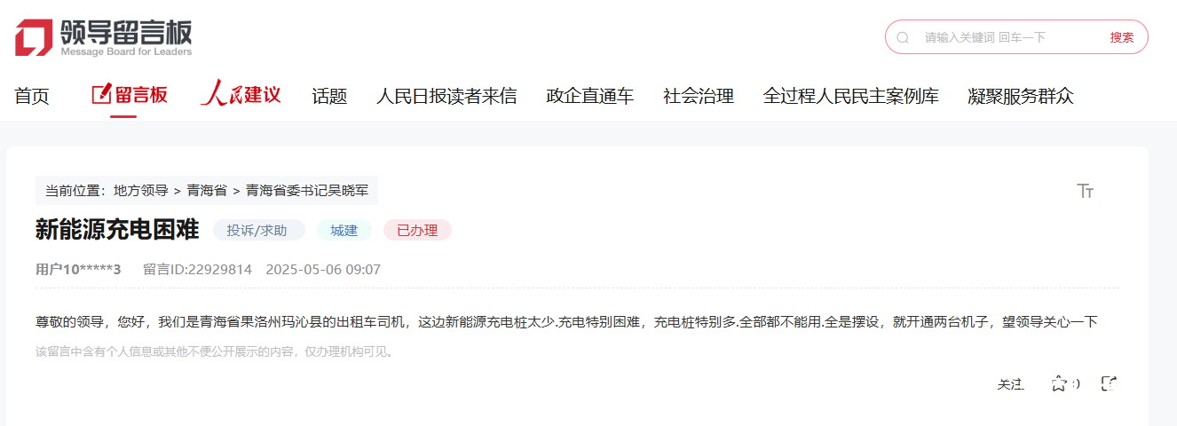 2025年5月,有群眾在人民網(wǎng)“領(lǐng)導(dǎo)留言板”留言表示,自己是青海省果洛藏族自治州瑪沁縣的出租車司機,當(dāng)?shù)匾呀?jīng)安裝了一些新能源充電樁,但都不能使用,能使用的充電樁也都屈指可數(shù),每次充電都要排1至2小時的隊,而且一度電2元。