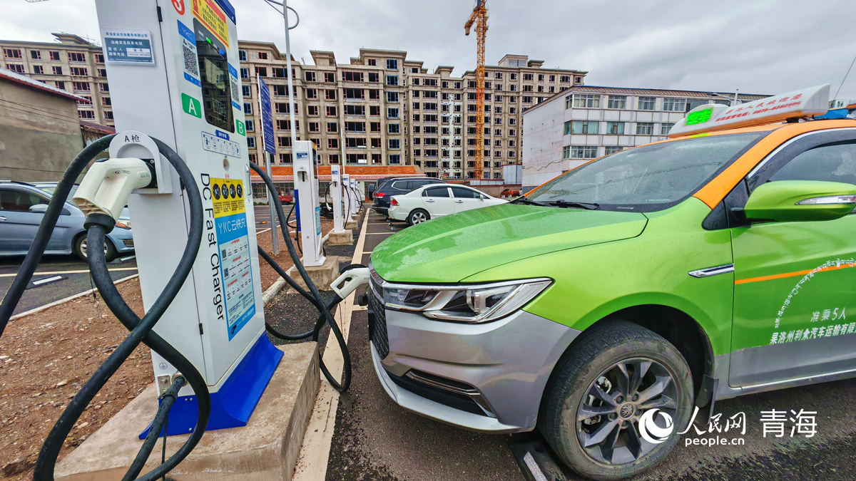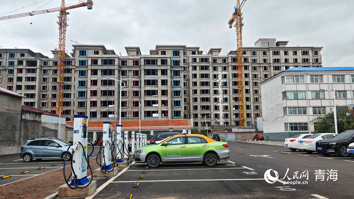 瑪沁縣八一路停車場充電站內(nèi),新能源車正充電。人民網(wǎng)記者 楊啟紅攝