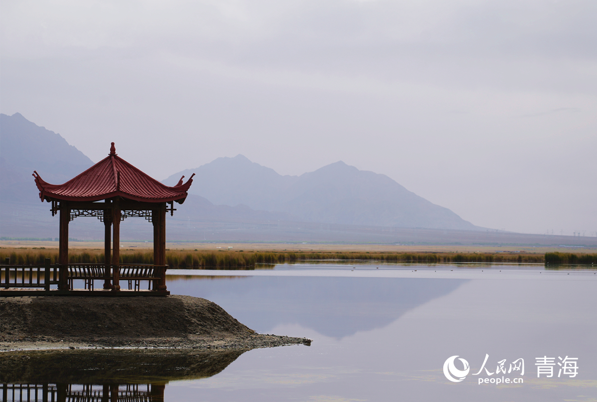 翡翠湖景區(qū),遠(yuǎn)山近水,蘆葦搖曳,戈壁不再荒涼。人民網(wǎng)記者 楊啟紅攝