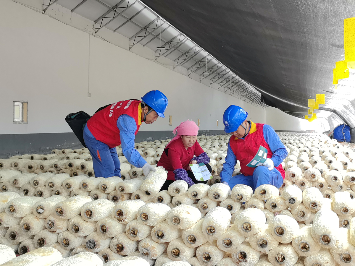 國網(wǎng)海東供電公司民和縣供電公司黨員服務(wù)隊(duì)員正在了解食用菌長勢。趙梅芳 攝