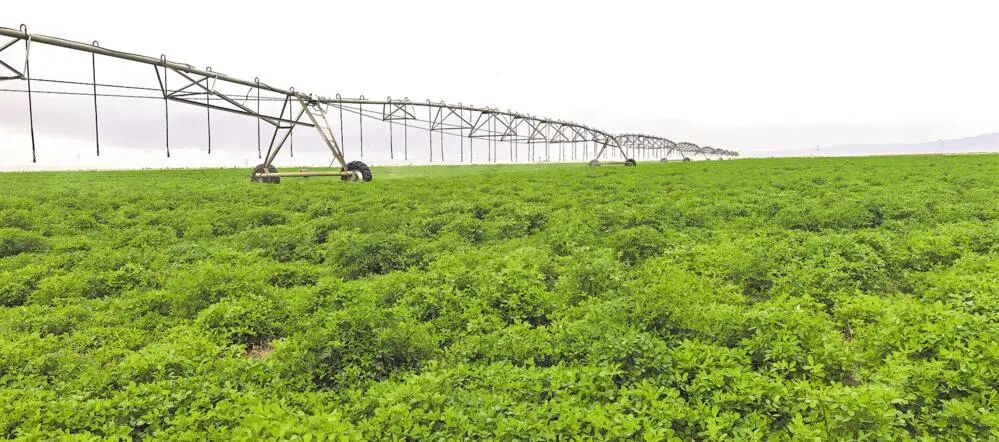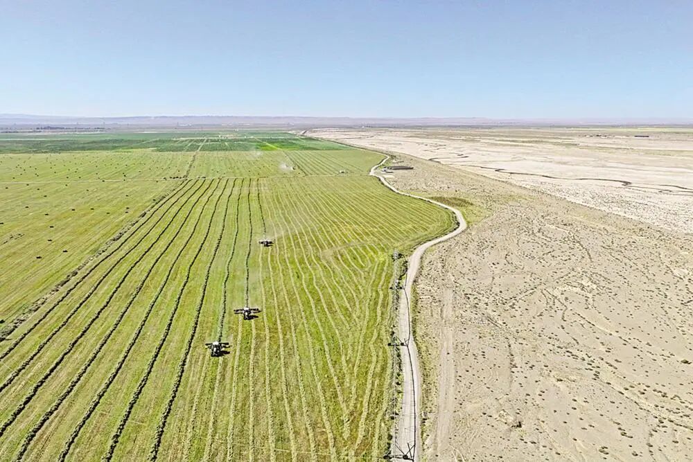 站在德令哈市尕海鎮(zhèn)陶哈村的田埂上,紫花苜蓿隨風(fēng)搖曳,燕麥草鋪就綠色地毯,大型噴灌機緩緩轉(zhuǎn)動,收割機在青海奔盛草業(yè)有限公司(以下簡稱“青海奔盛草業(yè)”)的萬畝飼草基地穿梭作業(yè)。誰能想到,這里曾是寸草難生的鹽堿荒灘,如今變成真正的良田。