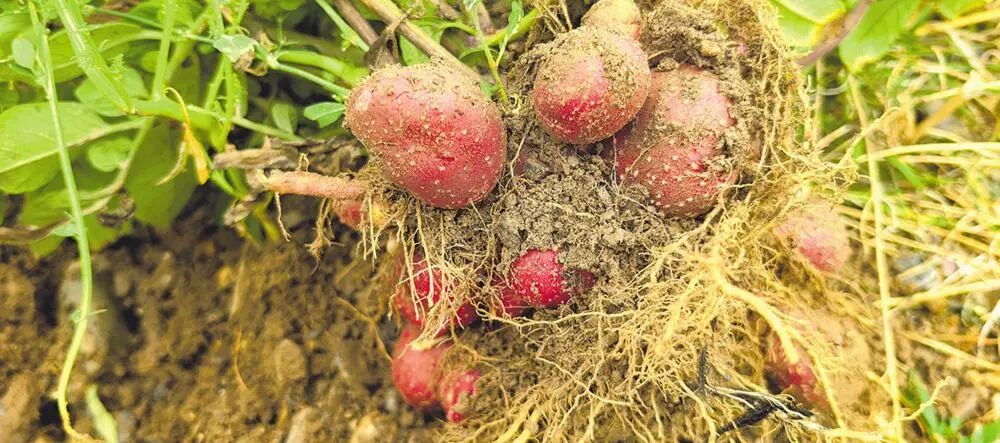 “今年土豆真爭氣!個頭像小拳頭,表皮光滑,煮著粉糯、炒著香甜,這是村里整合的集體地,我們跟著干,還有土豆分紅?!闭诜謷炼沟耐醢⒁膛踔炼剐χf。