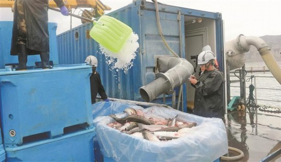 金秋時節(jié),正是豐收的好時候。記者來到青海龍羊峽庫區(qū),在龍洋知鮮(青海)股份有限公司的網(wǎng)箱養(yǎng)殖基地,目睹了一場忙碌而有序的三文魚收獲場景。網(wǎng)箱中,剛剛被捕撈上來的三文魚通過吸魚泵被輸送到放血流水線,工人熟練操作,魚身還在擺動,便已完成了放血處理。緊接著,這些三文魚進入冰鮮裝箱環(huán)節(jié),隨后被起吊裝船。不到一會兒,一箱箱包裝完畢的三文魚便駛離碼頭,送往各地餐桌。