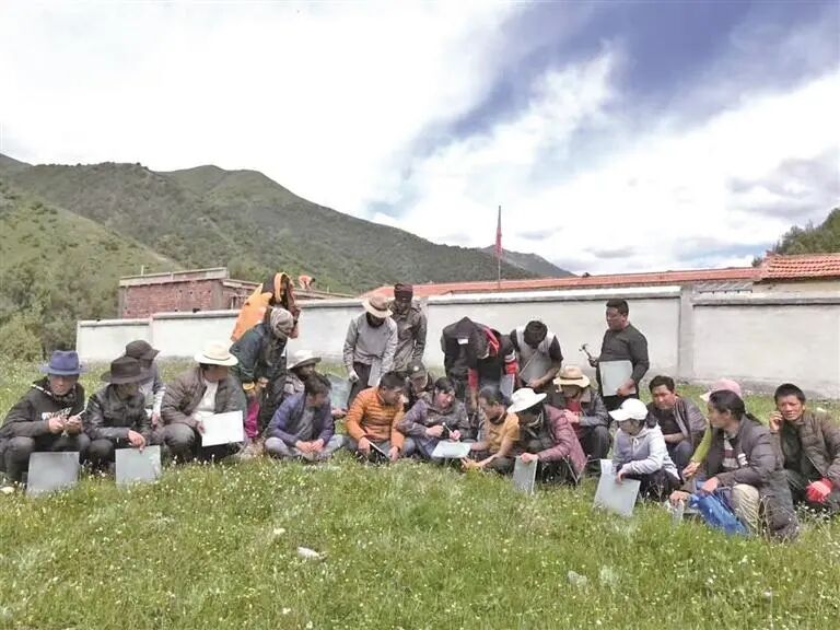 和日村的石雕藝人在草地上席地而坐,共同探討石雕技藝。受訪者供圖