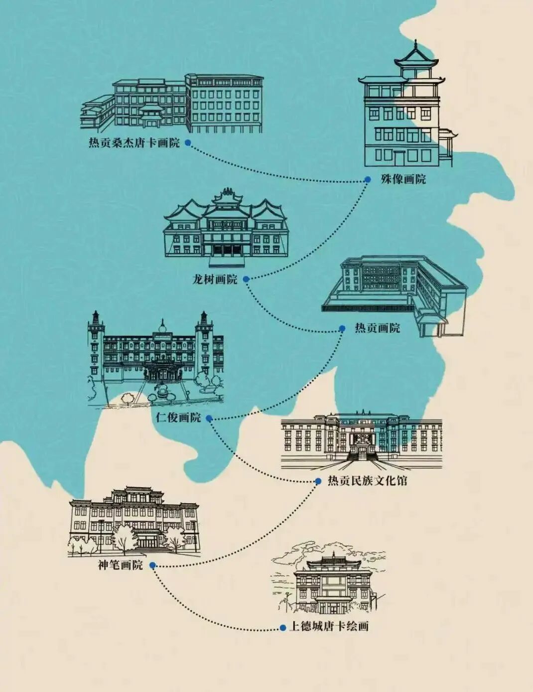 熱貢藝術(shù)博物館群文博走廊旨在秉持“以文塑旅、以旅帶商、以商促收”高質(zhì)量發(fā)展理念,著力推動(dòng)國際生態(tài)旅游目的地青南試驗(yàn)區(qū)熱貢文化生態(tài)高地建設(shè),走廊有效串起熱貢藝術(shù)民間博物館(仁俊院)、國家級文化產(chǎn)業(yè)示范基地、國家級非物質(zhì)文化遺產(chǎn)生產(chǎn)性保護(hù)示范基地(熱貢畫院)、國家AAA景區(qū)+綜合畫院(龍樹畫院)等規(guī)模性、標(biāo)準(zhǔn)性畫院17家,構(gòu)建設(shè)計(jì)“探源文脈·文博走廊”特色線路,同步完善“一院一格”文博走廊表示系統(tǒng),置設(shè)熱貢藝術(shù)博物館群文博走廊大型總導(dǎo)覽2處,設(shè)計(jì)完成文博走廊核心區(qū)動(dòng)態(tài)、靜態(tài)游覽地圖,實(shí)現(xiàn)線下導(dǎo)航、云上觀展、預(yù)約訂單等多重功能。