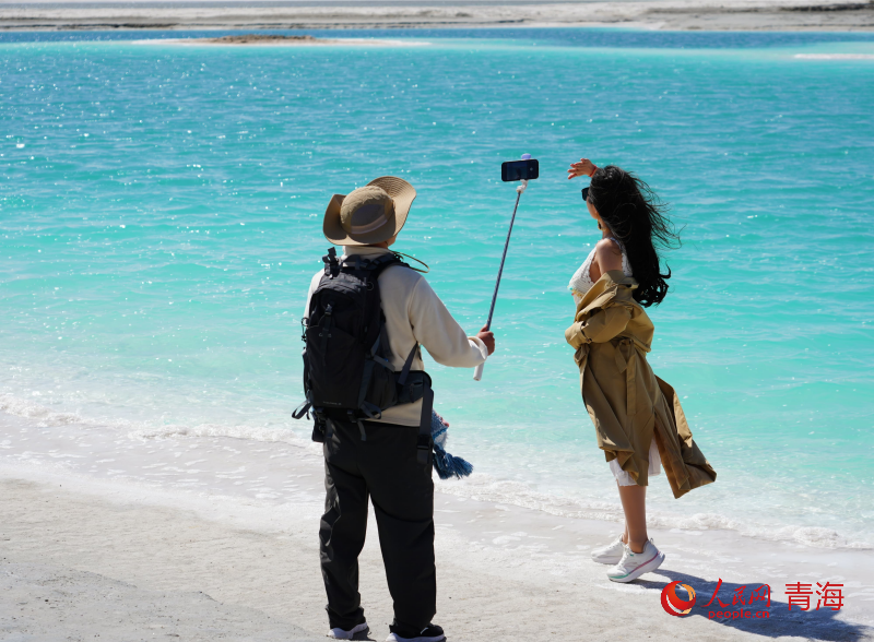 游客在大柴旦翡翠湖拍照。人民網(wǎng)記者 況玉攝