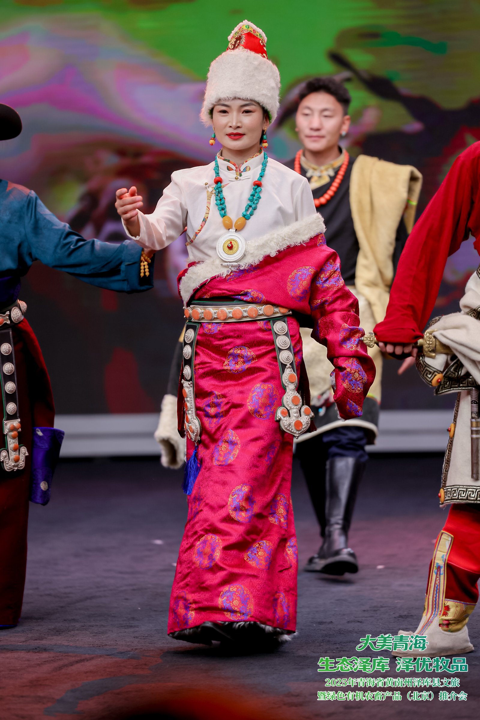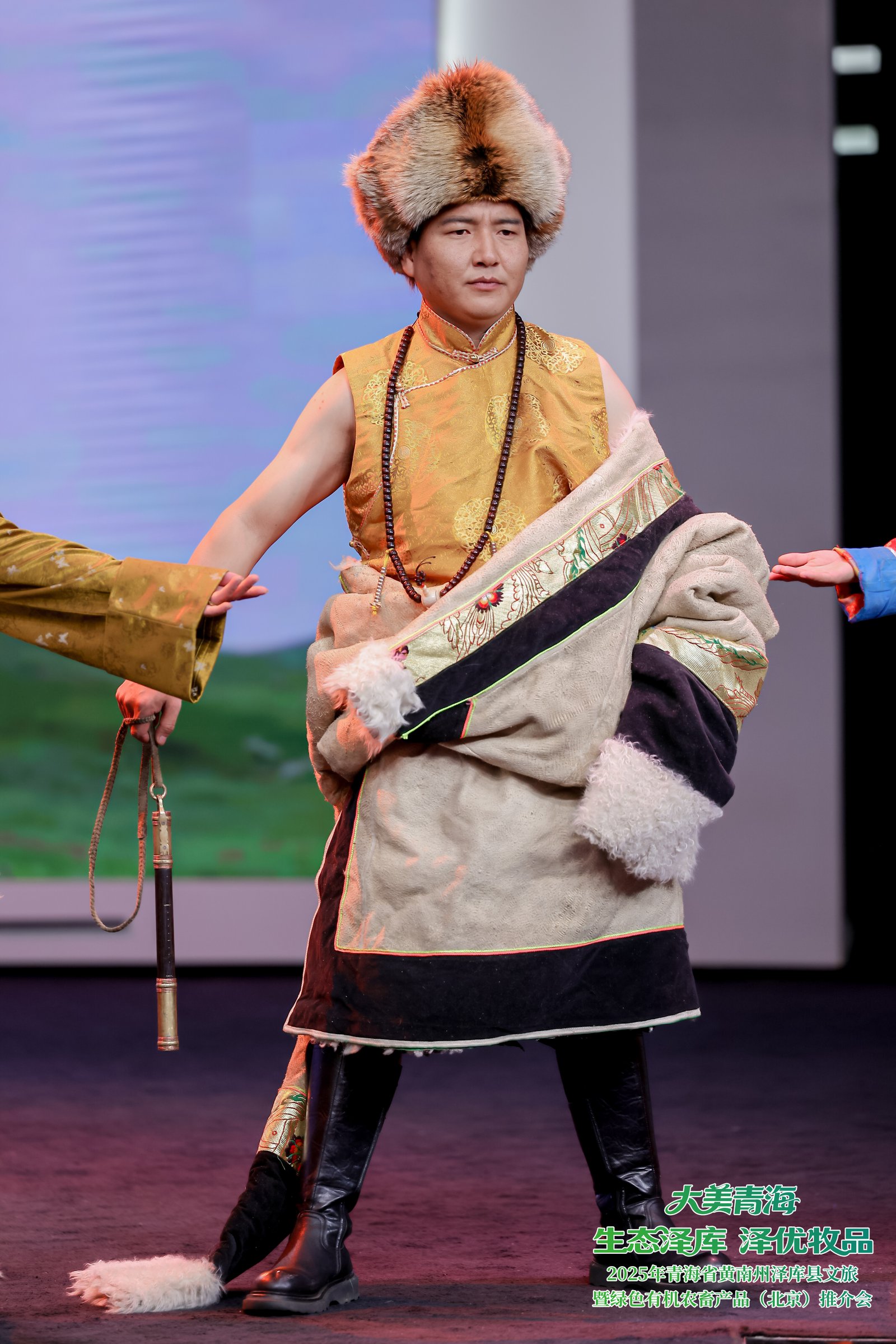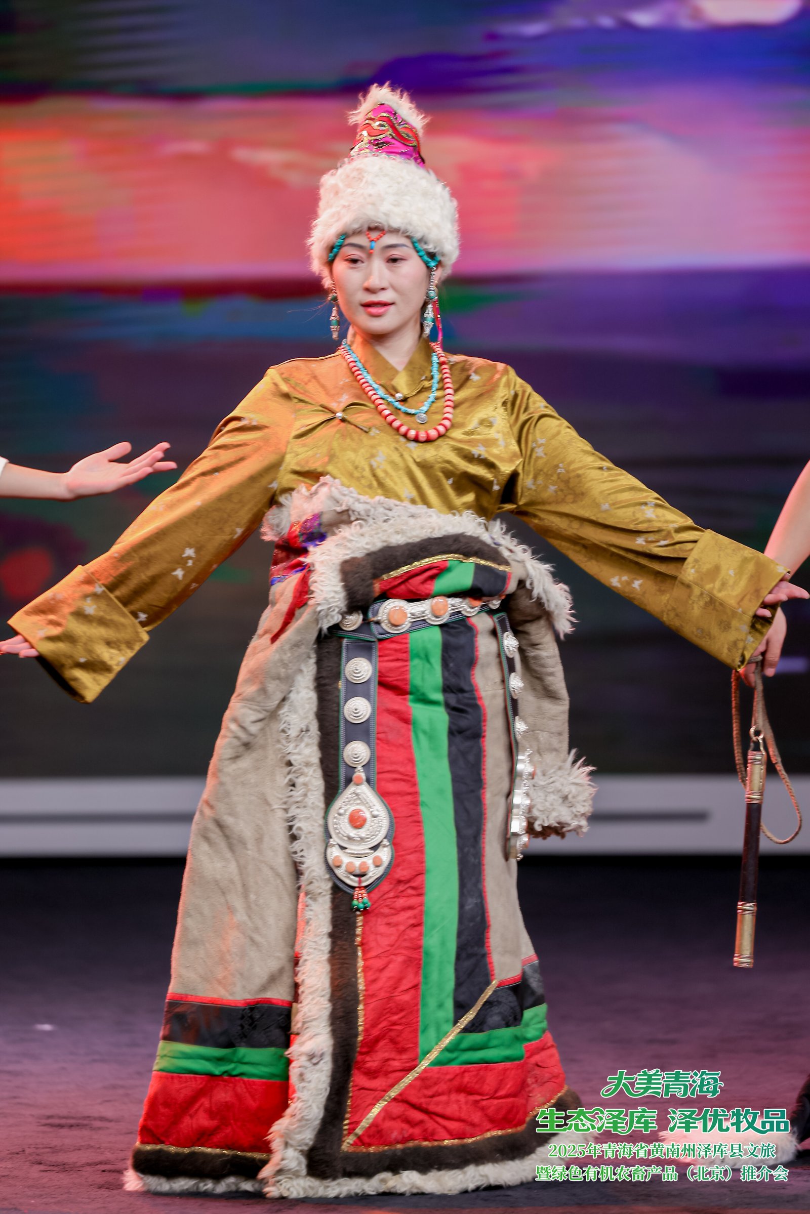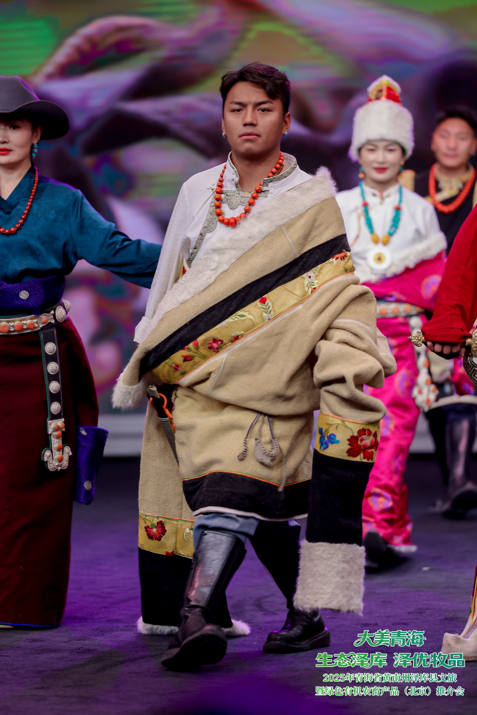 衣袂翻飛,華服流彩,這些藏族服飾皆來(lái)自澤庫(kù)草原深處的匠心傳承。金銀絲線在深色氆氌上蜿蜒出吉祥紋樣,針針縝密,承載著牧人對(duì)天地自然的敬畏與祈愿。碩大的琥珀、紅珊瑚、綠松石串聯(lián)成厚重的頸飾與發(fā)辮裝飾,隨著步伐搖曳輕響,那是草原的風(fēng)聲、牧歌的旋律凝聚成的璀璨音符。羊皮長(zhǎng)袍的毛邊在燈光下泛著柔和光澤,講述著草原游牧文化的傳承故事。